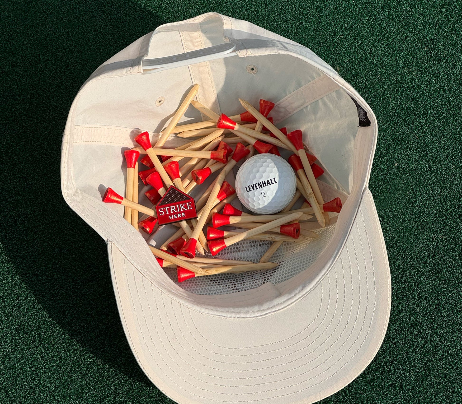 1 package of Striker Tees, 1 Strike Here Ball Marker, and 1 sleeve of MF-3U golf balls.